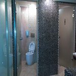 Αποφασίσαμε από κοινού αρχικά να αλλάξουμε το ύφος του μπάνιου προσδίδοντας τελείως διαφορετικό αποτέλεσμα. Έγινε αποξήλωση των παλαιών πλακιδίων του χώρου και των ειδών υγιεινής, προστέθηκε διαχωριστικό ανάμεσα στους χώρους ανδρών και γυναικών του W.C. Επιλέξαμε φωτισμό κατάλληλο που θα τόνιζε τις ιδιαίτερες επιφάνειες του χώρου.